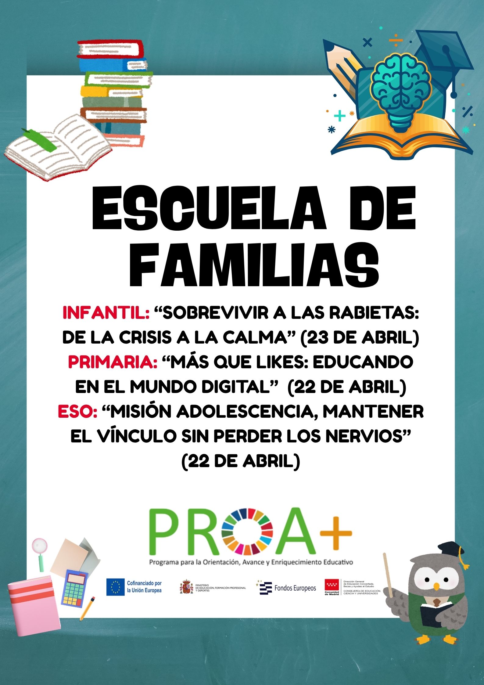 - ESO: El taller que vamos a realizar este trimestre tiene el título «Misión adolescencia, mantener el vínculo sin perder los nervios» y será el miércoles 22 de abril de 17:15 a 18:15. La ponente, Verónica Patón, continuará trabajndo el tema de la adolescencia. Será un taller donde reflexionaremos juntos sobre cómo mantener ese vínculo con los adolescentes en una etapa tan complicada.