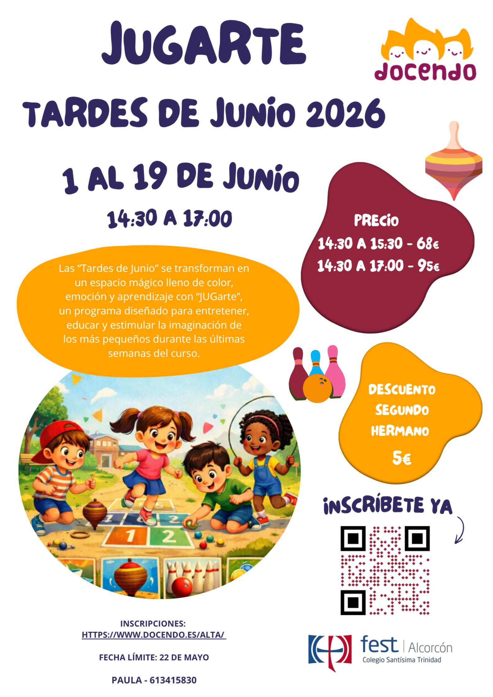 Estimadas familias: nos complace presentaros una propuesta muy especial para las últimas semanas del curso (del 1 al 19 de junio): la Escuela de Verano en horario de “Tardes de Junio”, que este año llega bajo el nombre de JUGArte.